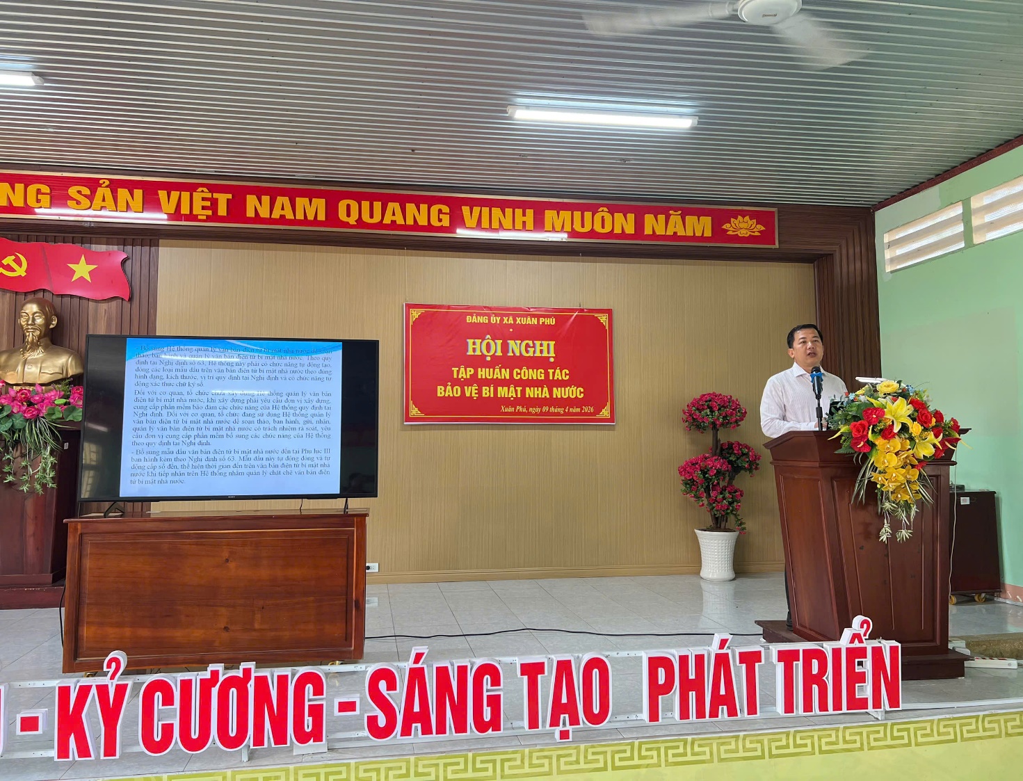 Thực hiện Kế hoạch số 42-KH/ĐU ngày 17/3/2026 của Đảng ủy xã Xuân Phú về tổ chức hội nghị tập huấn công tác bảo vệ bí mật nhà nước (BMNN), Công an xã Xuân Phú đã chủ động phối hợp với Phòng An ninh chính trị nội bộ Công an tỉnh tổ chức hội nghị tập huấn và triển khai các văn bản hướng dẫn thi hành cho đội ngũ cán bộ, công chức, viên chức các cơ quan, ban, ngành trên địa bàn.